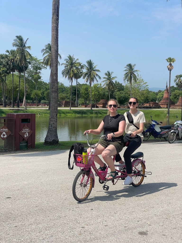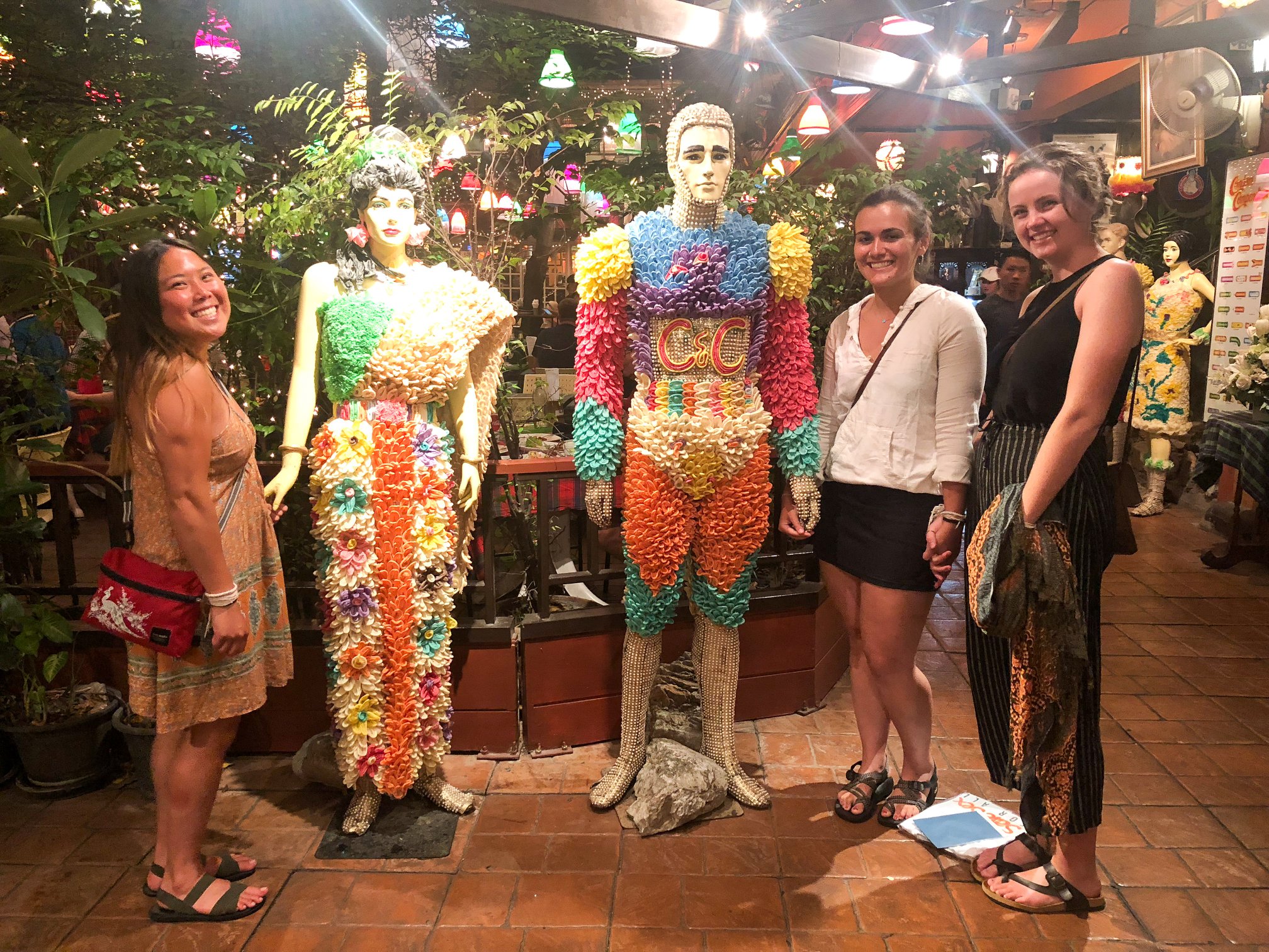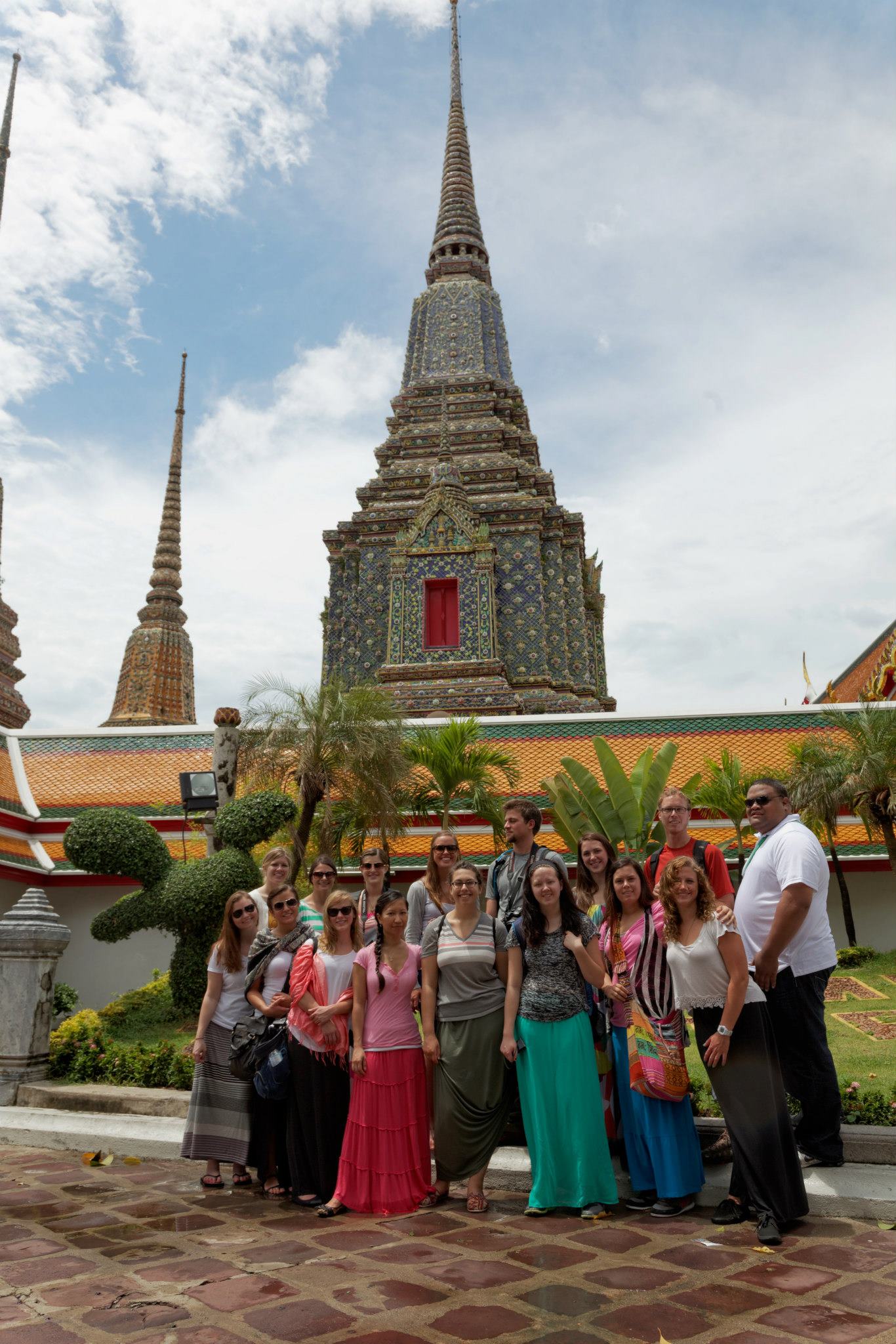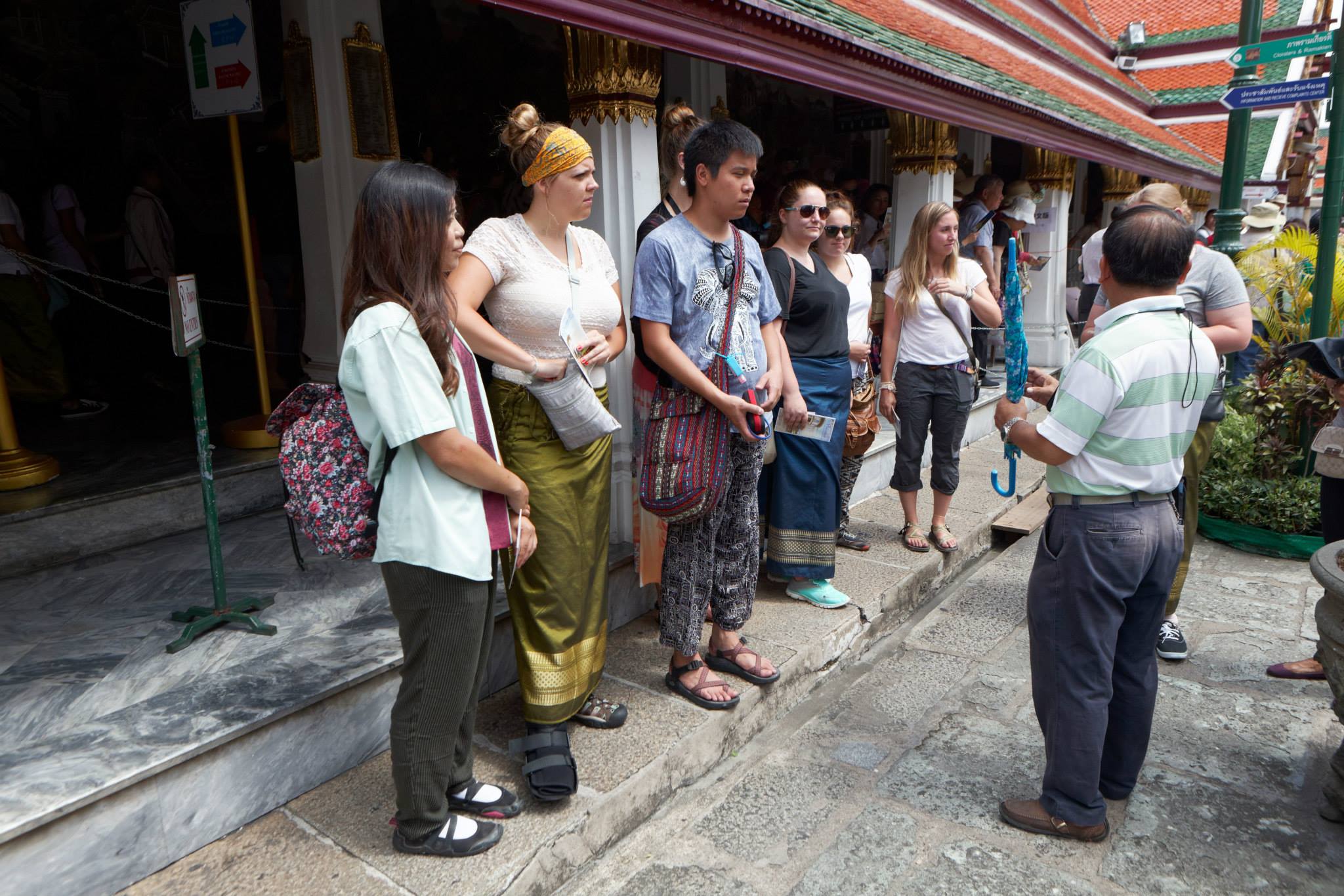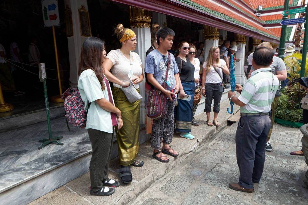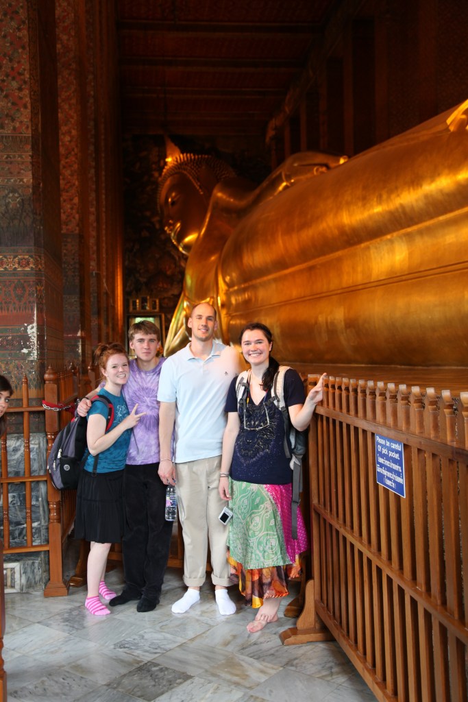 These are places that are holy to most Thais, and therefore you MUST dress appropriately. You need to dress conservatively, which means long pants for men, and long pants or dresses (to ankles) and covered shoulders for women. A good idea for women is to bring the sarong (a wraparound long skirt) that we will be providing you and carry it with you, so you can use it as a shawl or a skirt. Plus, a Thai silk sarong is something you’ll probably want to buy anyways. Please refer to the picture below. Notice they are wearing shirts with sleeves, not too revealing, and either longer capri pants or a sarong. In fact, those sarongs were rented at the temple because their pants were too short.